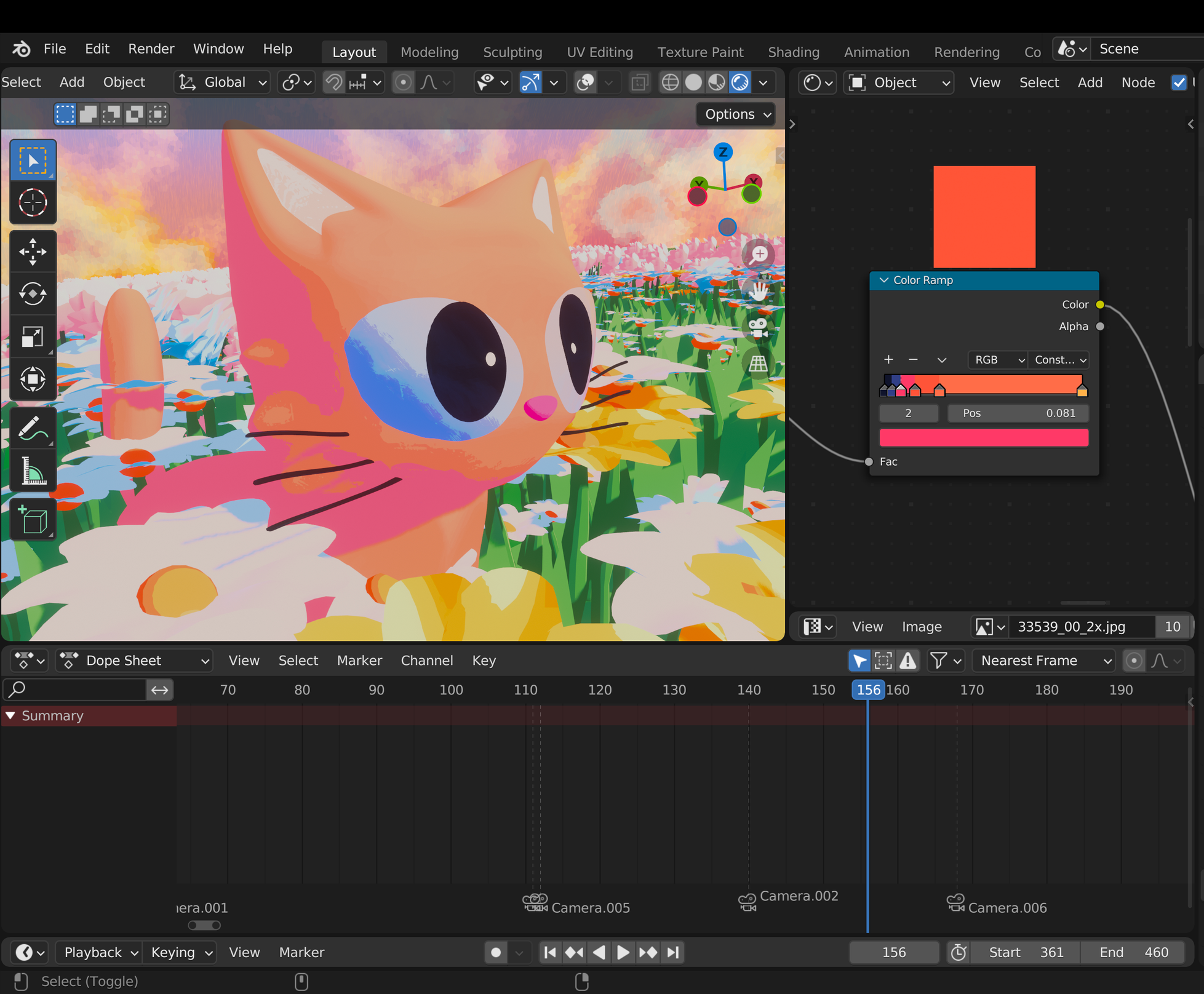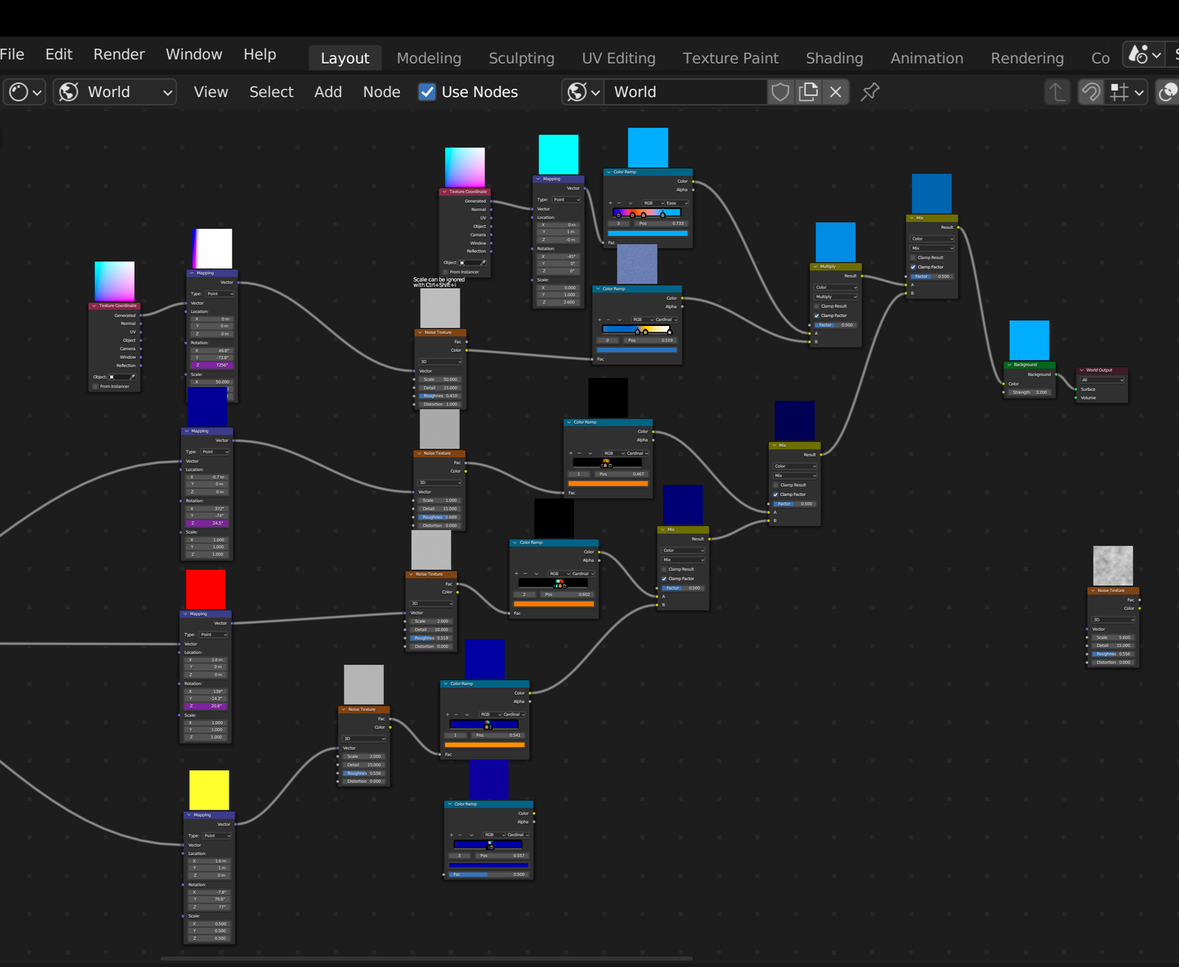 The following node setups highlight the selected color palettes, along with the use of a Shader to RGB node connected to a Principled BSDF. I also incorporated noise textures to introduce a brushstroke-like effect and control that painterly feel.