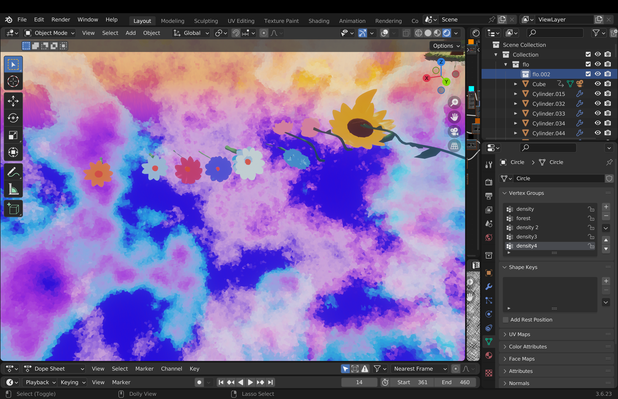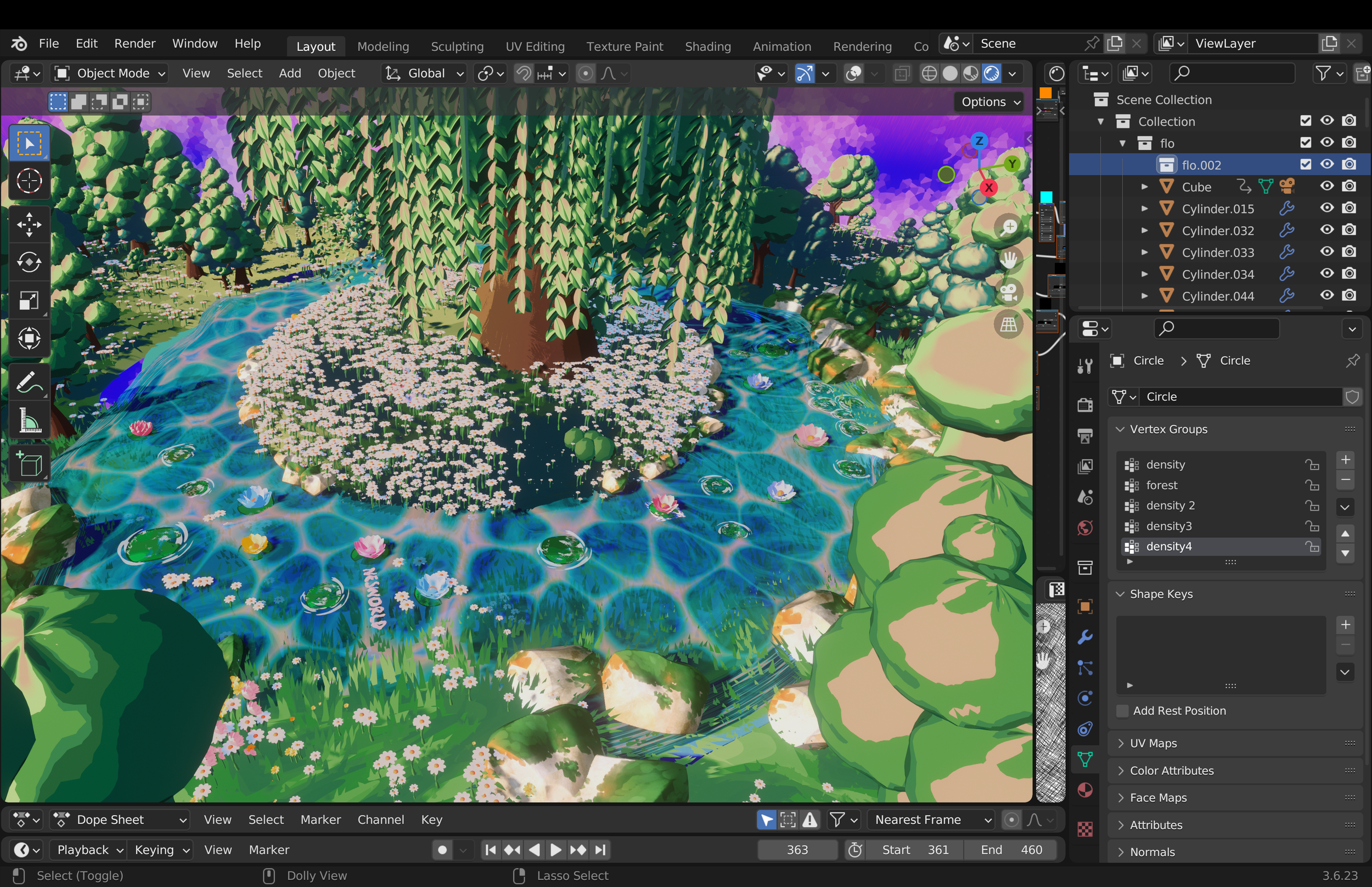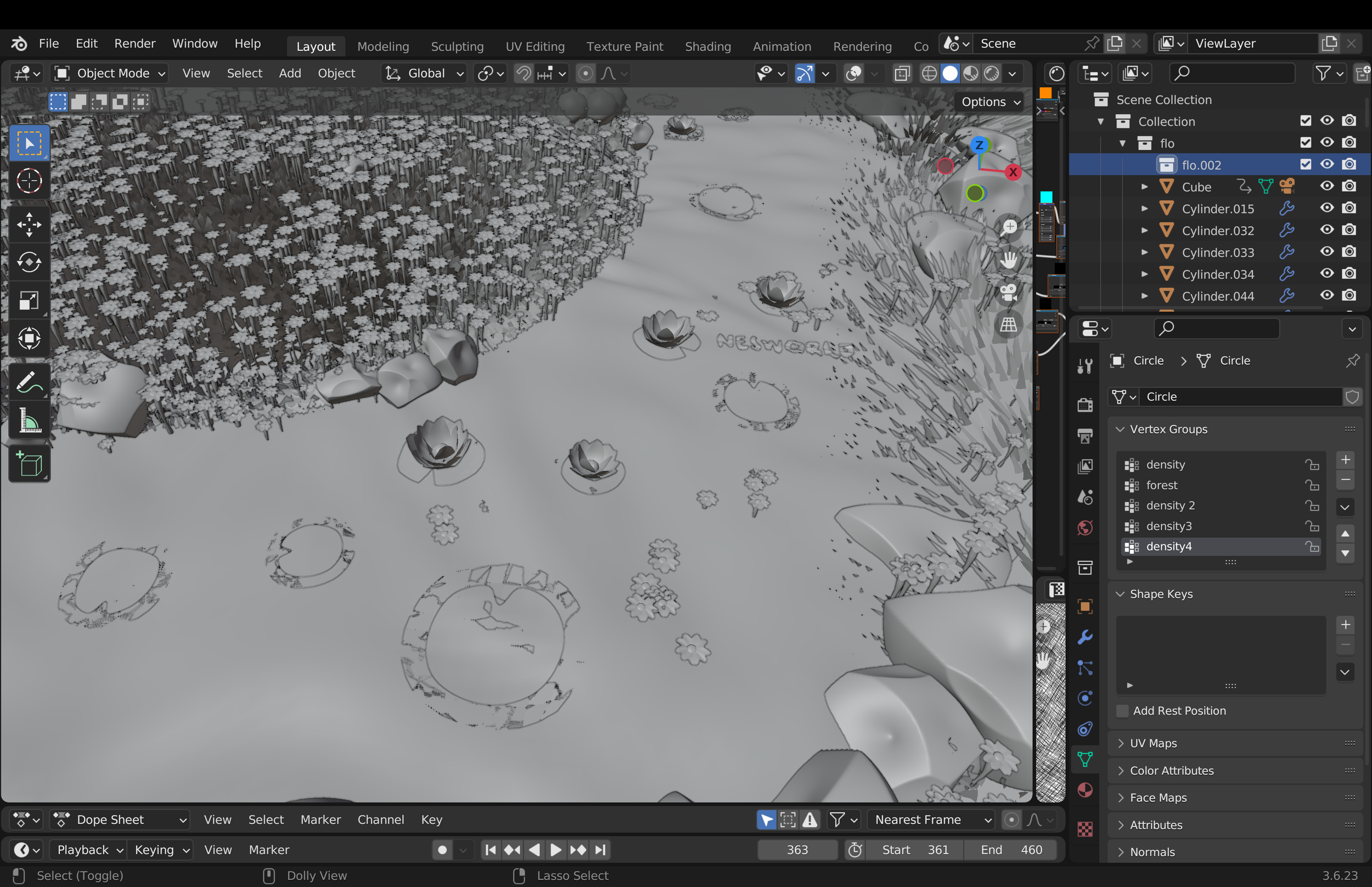 For the flower field, I created a variety of flowers with different shapes and colors, then used the particle hair system to scatter them across the terrain. By controlling their placement with vertex groups and adjusting density through weight painting, I was able to achieve a more natural, organic-looking field.
