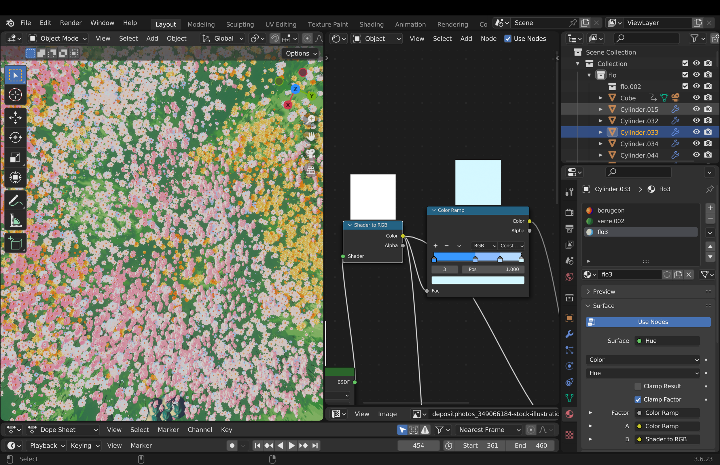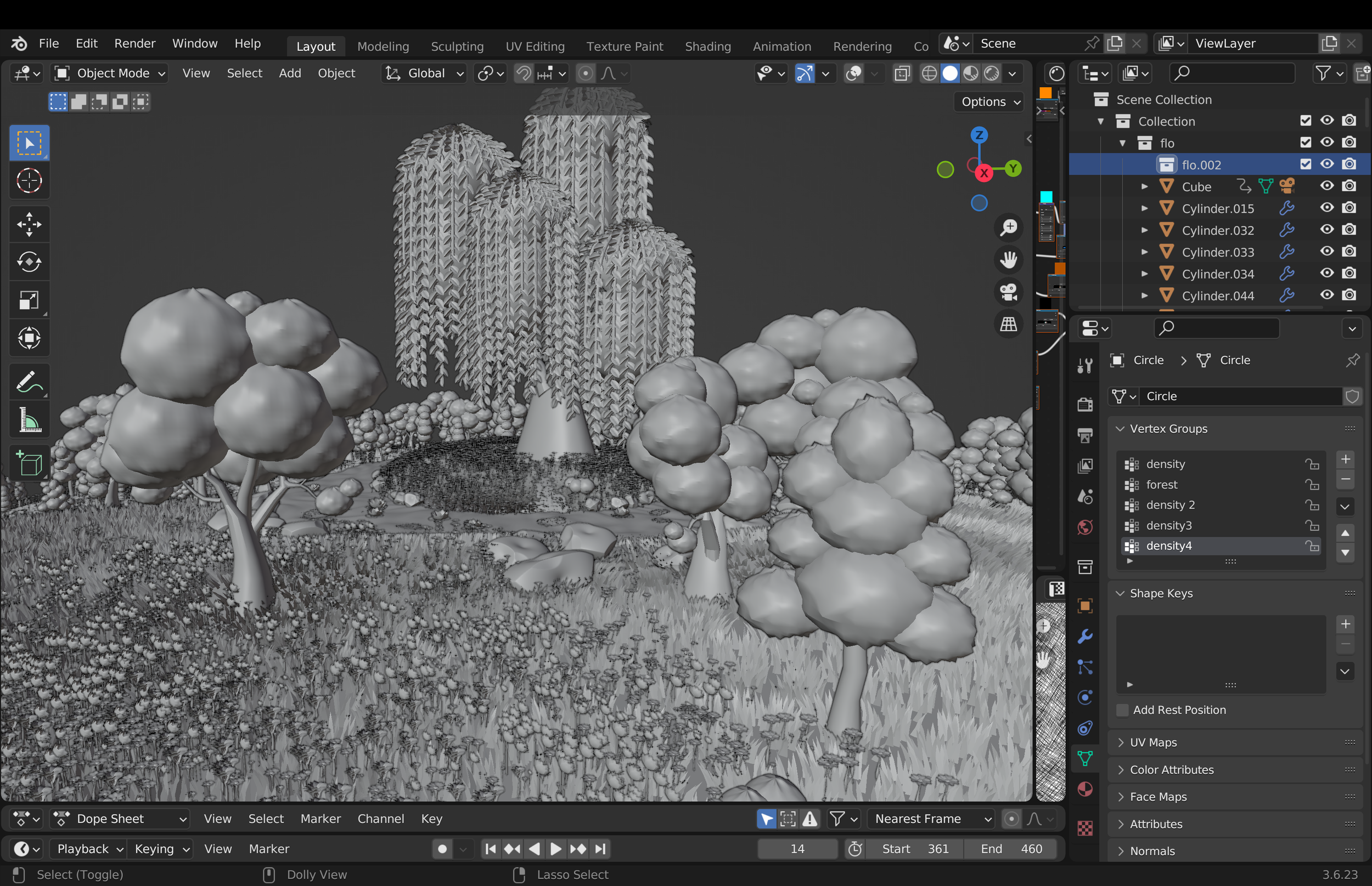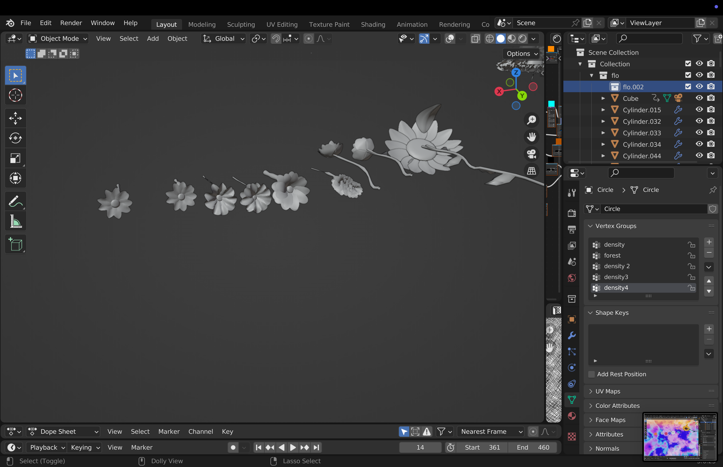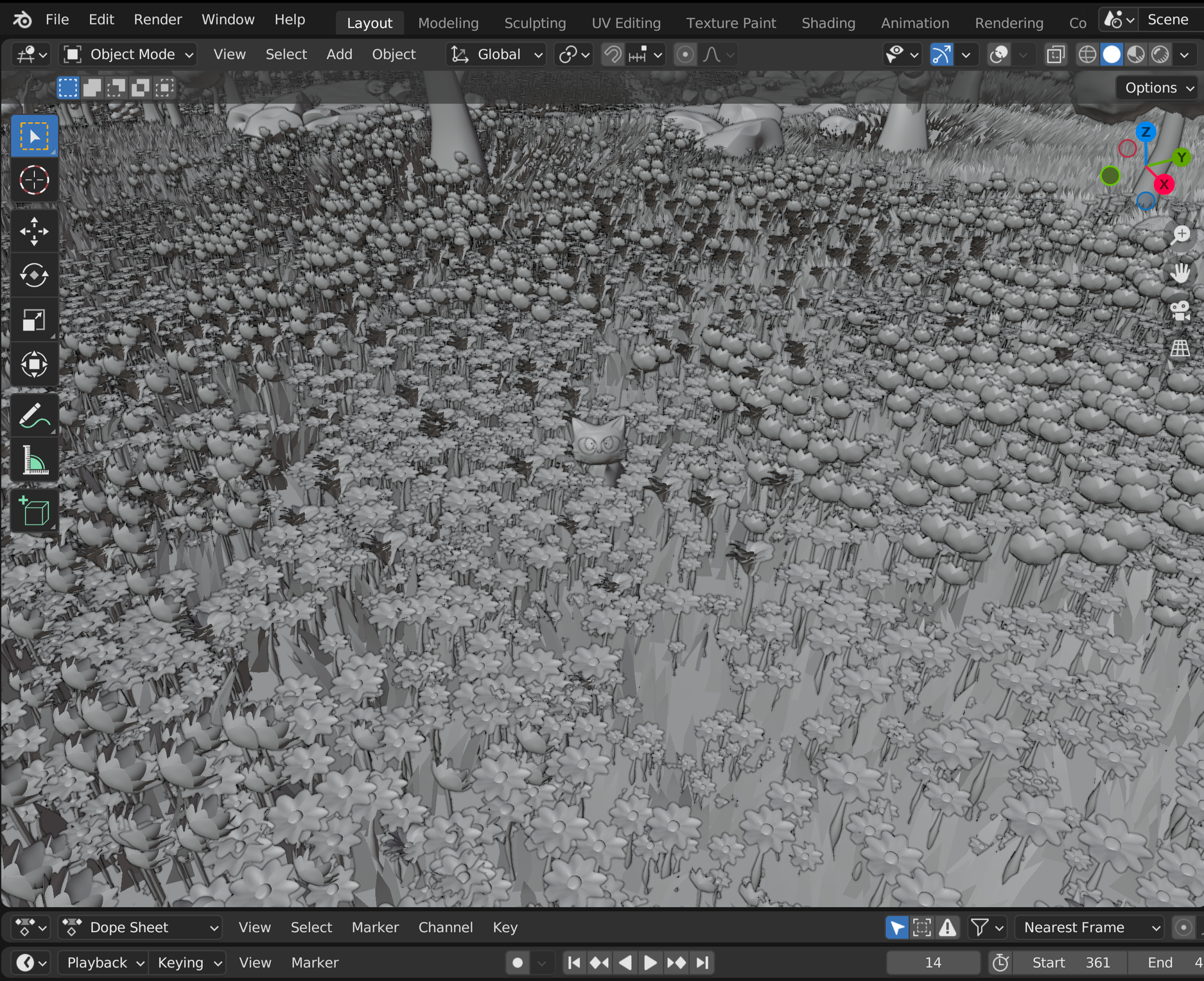 For the flower field, I created a variety of flowers with different shapes and colors, then used the particle hair system to scatter them across the terrain. By controlling their placement with vertex groups and adjusting density through weight painting, I was able to achieve a more natural, organic-looking field.