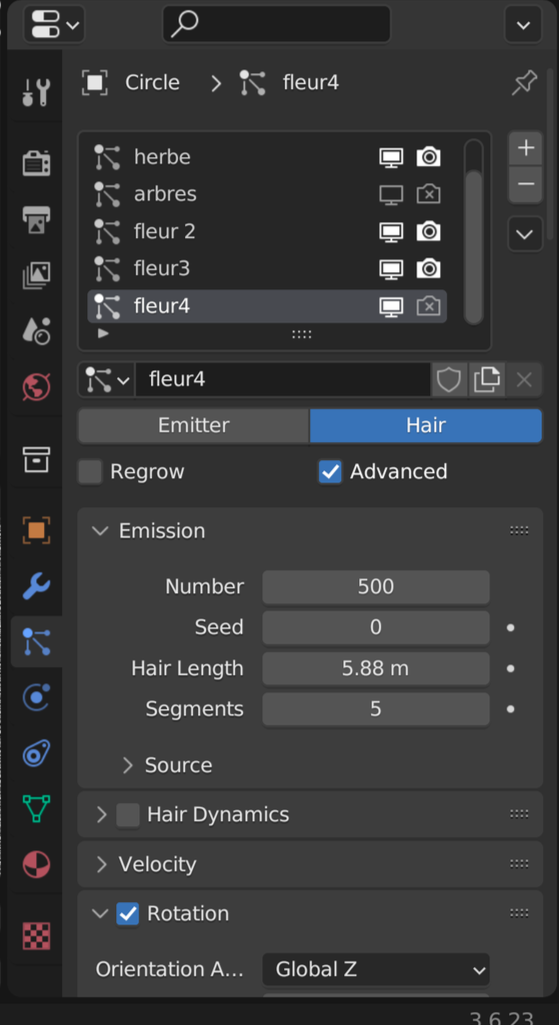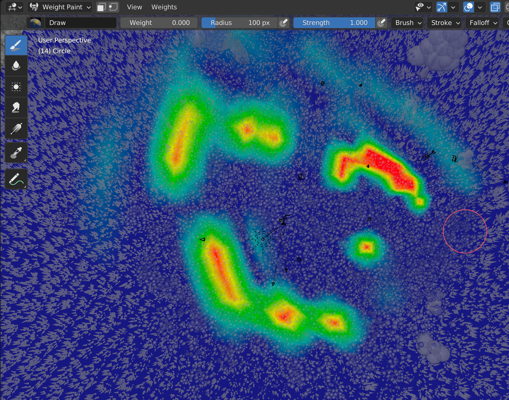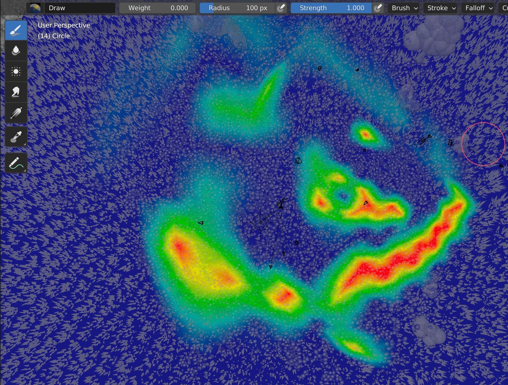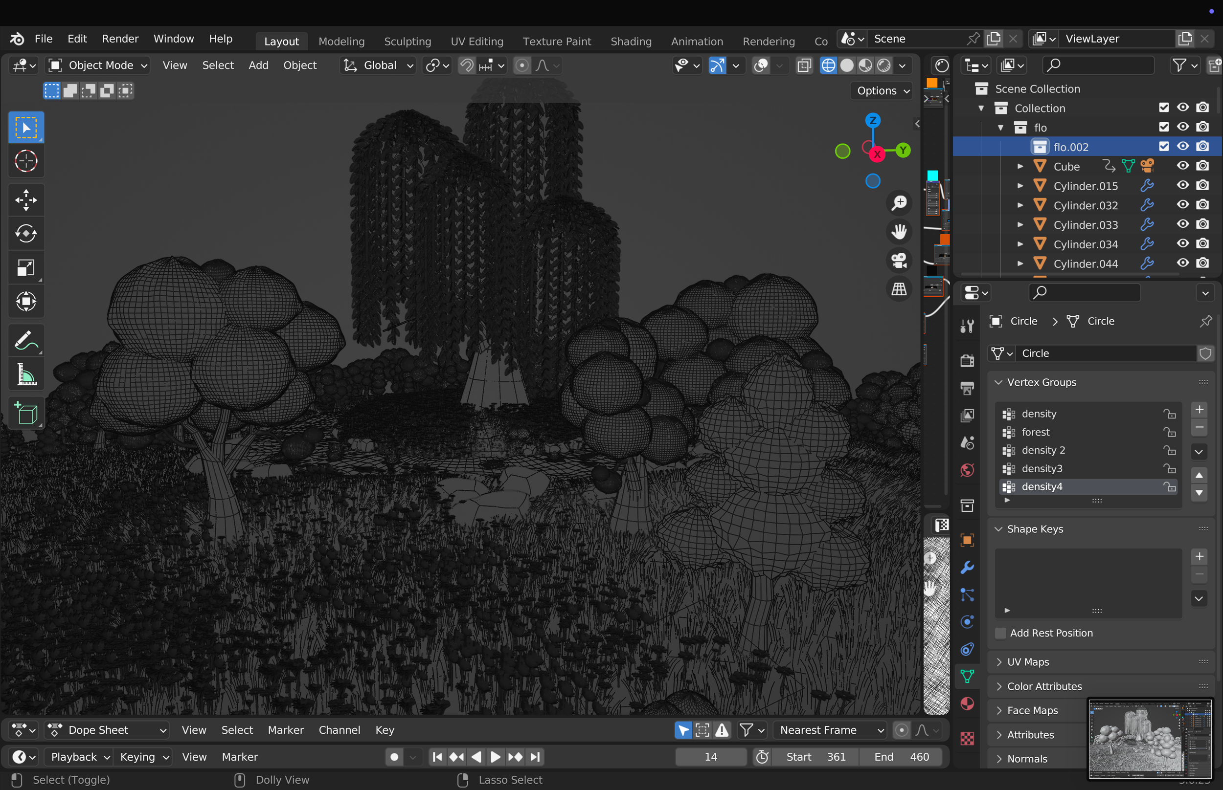 For the flower field, I created a variety of flowers with different shapes and colors, then used the particle hair system to scatter them across the terrain. By controlling their placement with vertex groups and adjusting density through weight painting, I was able to achieve a more natural, organic-looking field.