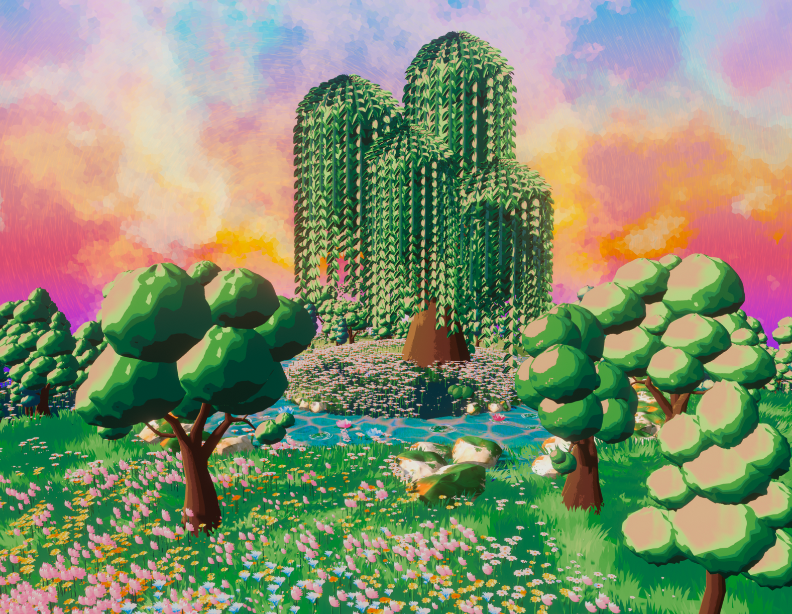 When modeling, I decided to divide the environment into two main areas for the video : one being a wide flower field, and the other a more intimate space featuring a large willow tree surrounded by flowers, along with a small pond filled with water lilies.