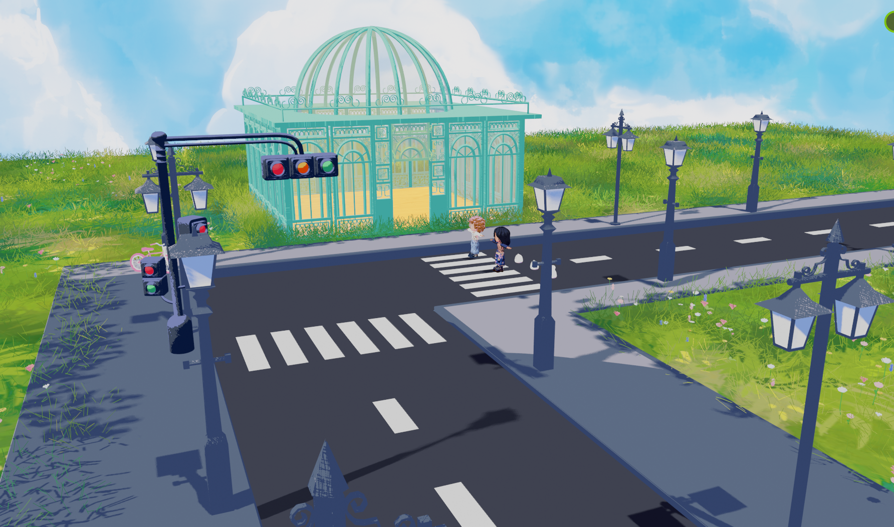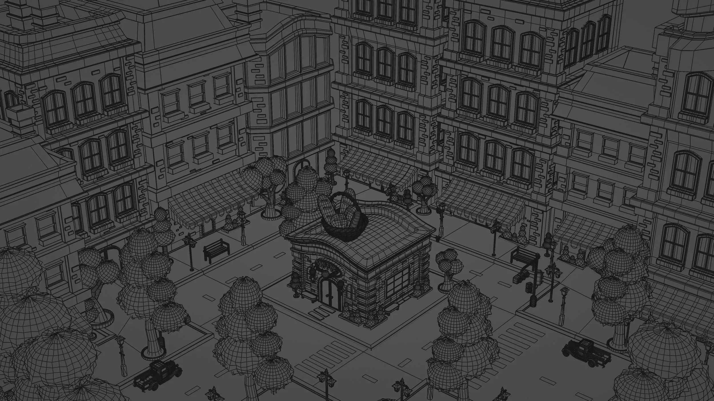 I was really short on time, so I had to work smart. I modeled four or five base buildings, made them look different by tweaking the textures, then duplicated them to build the scene faster. After that, I could focus on all the fun details, trees, plants, flowers, grass, benches, street lamps, traffic lights, all of that. Honestly, it was super enjoyable, and I’m really glad I got to learn more about building modeling along the way.
