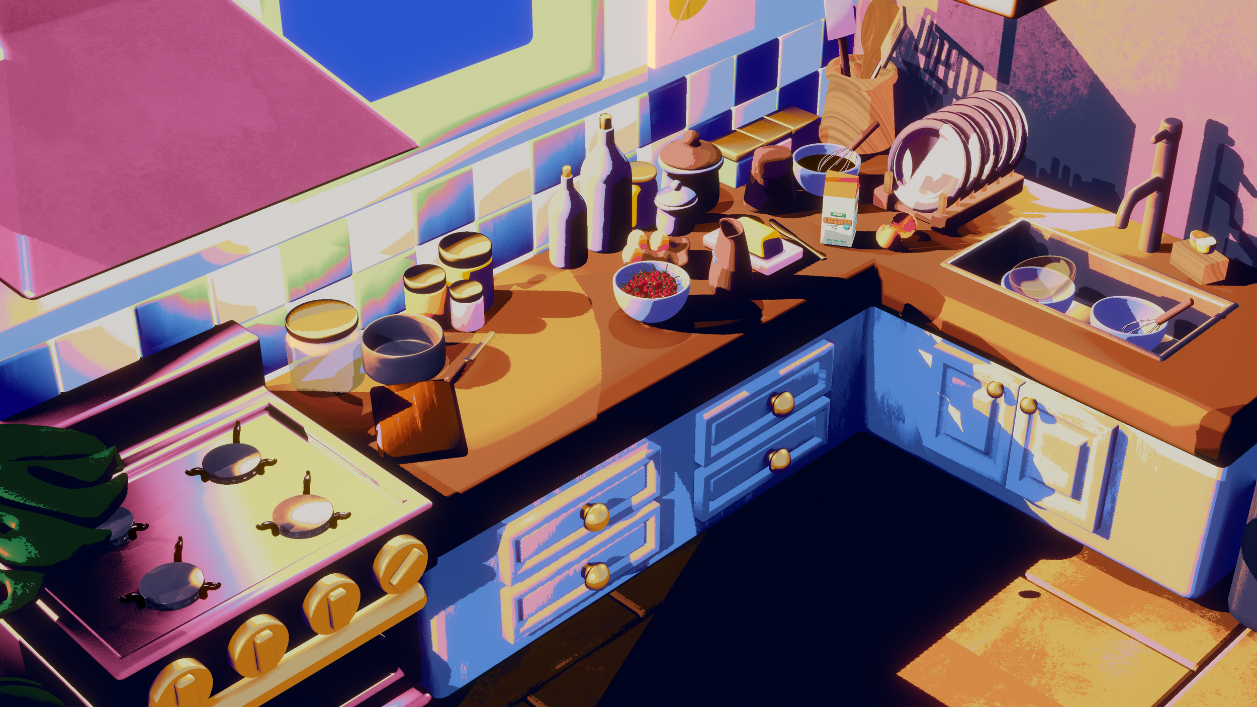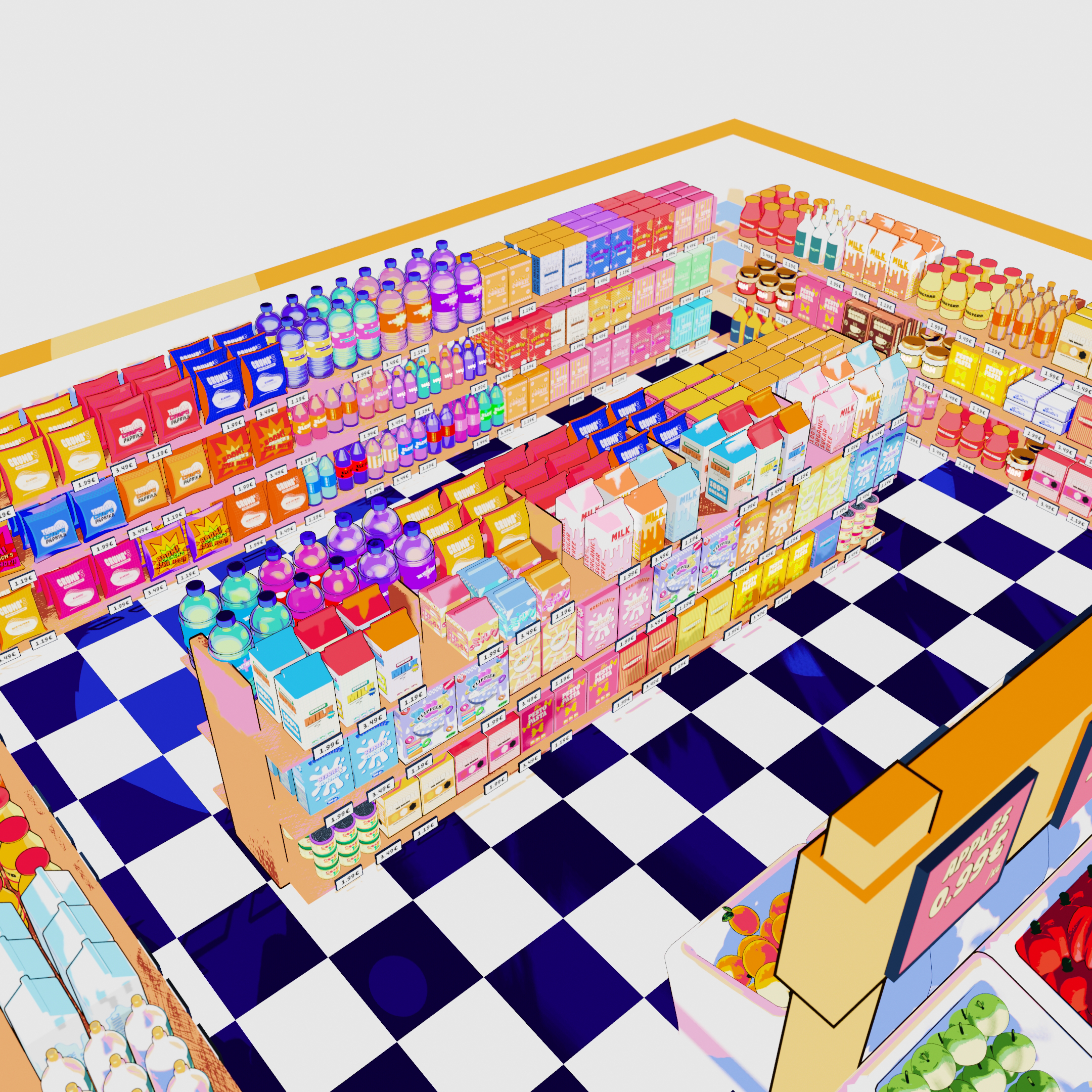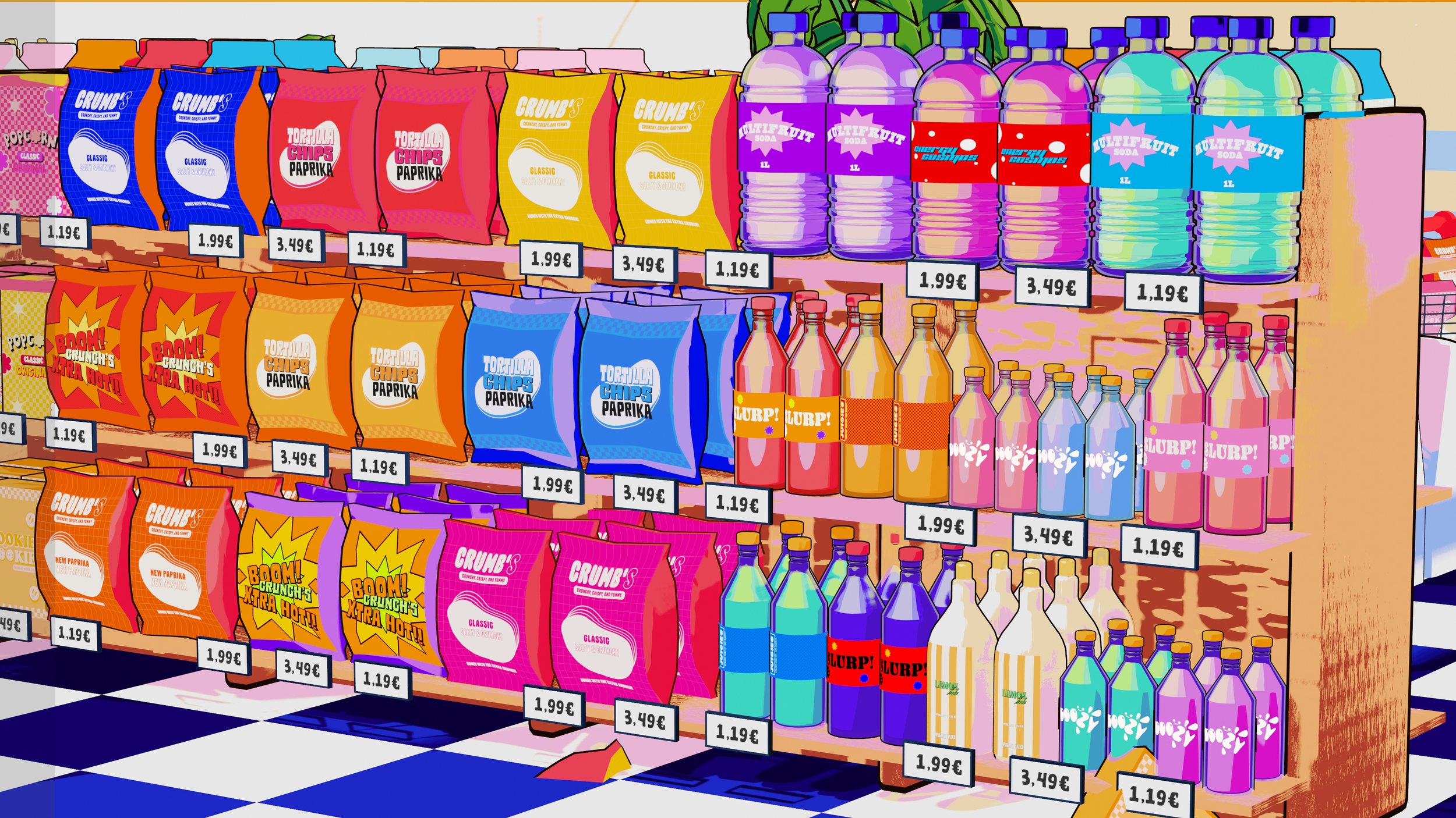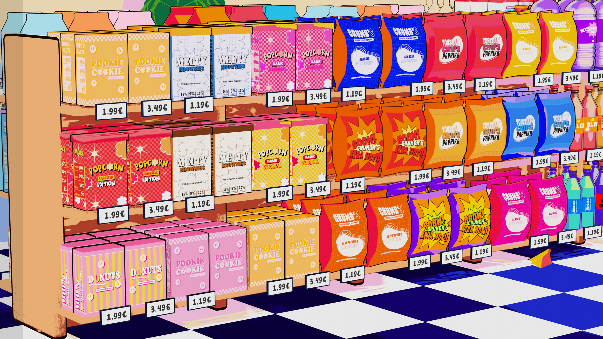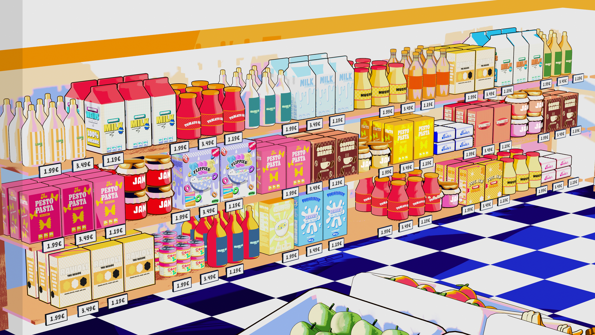 I modeled and designed this supermarket for the Grocery Heist video. The environment plays a key role, since the entire animation takes place there and revolves around the Flippies’ shenanigans inside the store. It was therefore important for the design to feel coherent and fully integrated into their world, supporting the story as it unfolds.